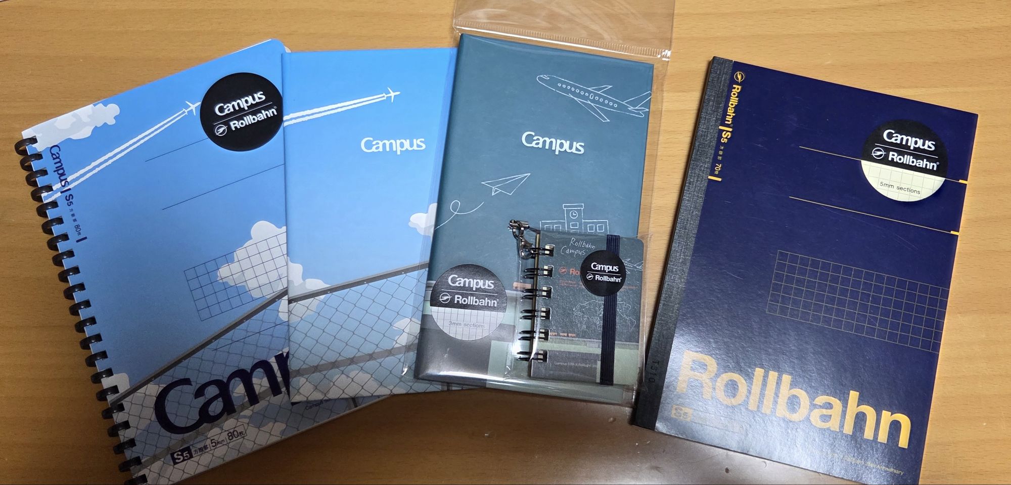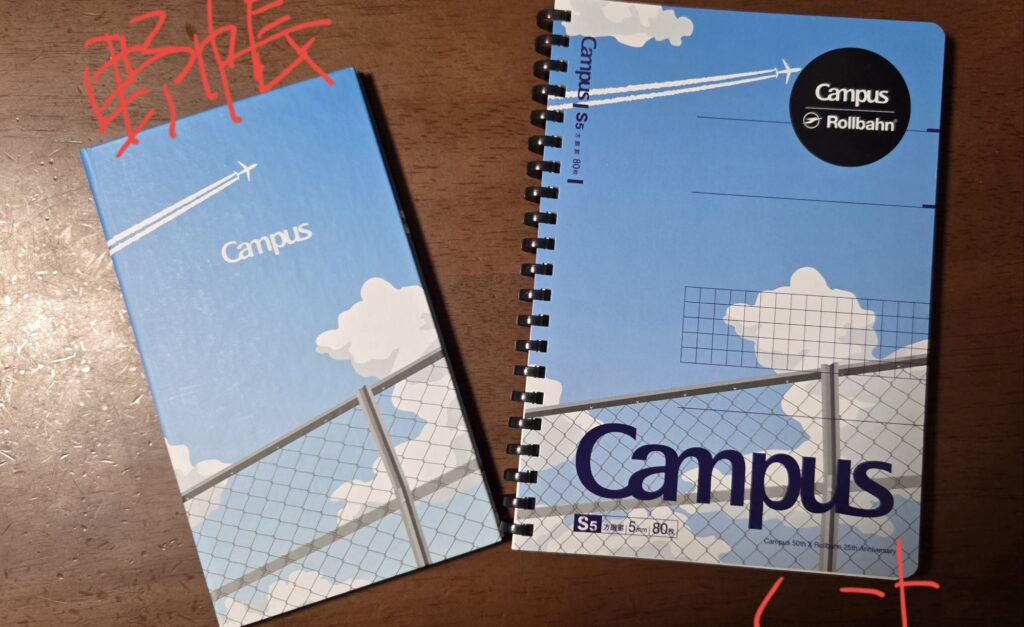 デザインといえば、今回、何種類か手にした中で一番のお気に入りは、青空を飛行機がゆくデザイン。 Campusのどこか懐かしいノートの世界に、Rollbahnの象徴である飛行機が飛び込んできたような、自由な空気感。この表紙を開くたびに、どこか遠くへ行きたくなるような、そんなワクワクをくれる一冊です。
