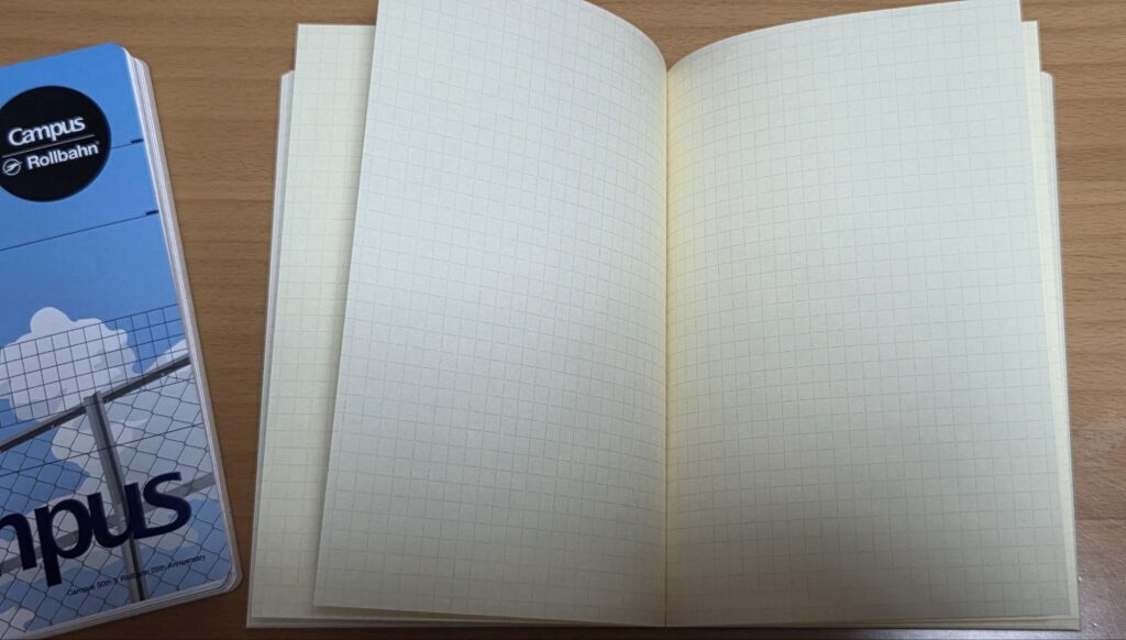 おなじみの表紙(キャンパスデザインなのにロルバーンの文字)をめくると、あのクリーム色の紙と黄色の5mm方眼が現れる、意外性のある構成。