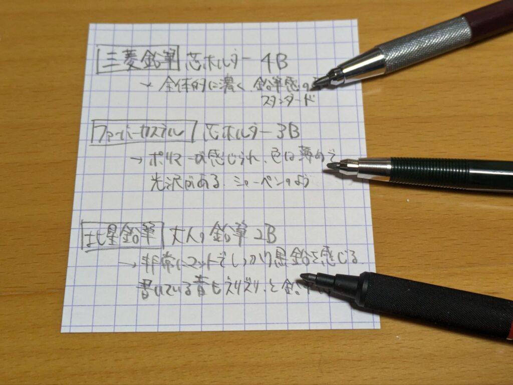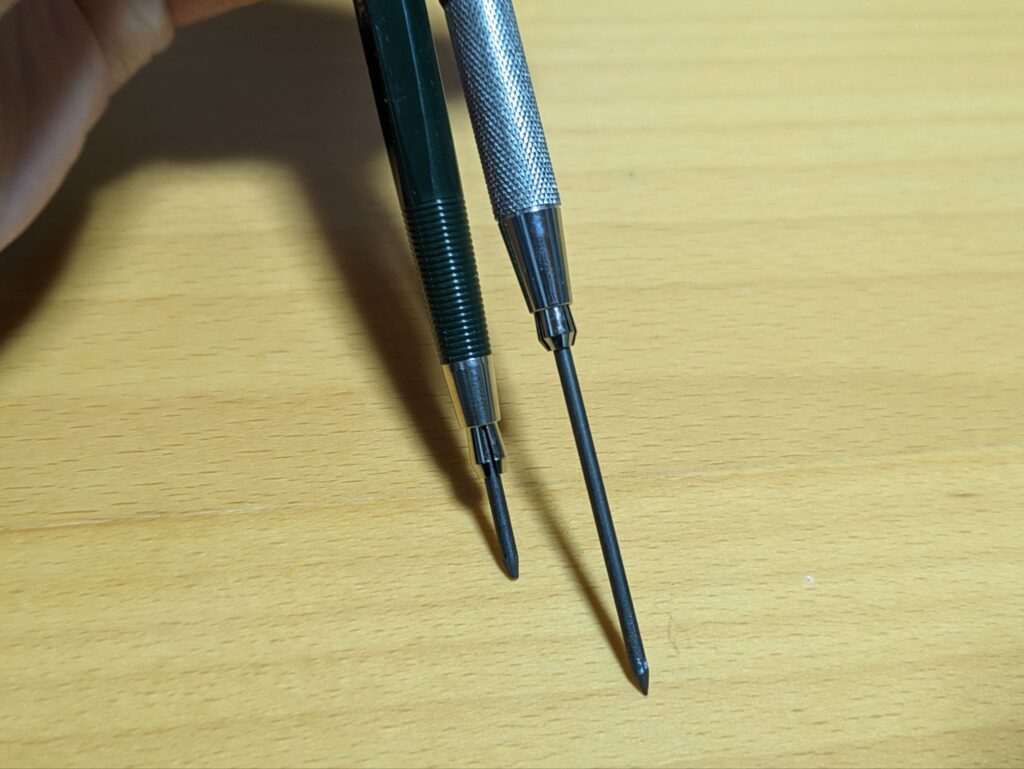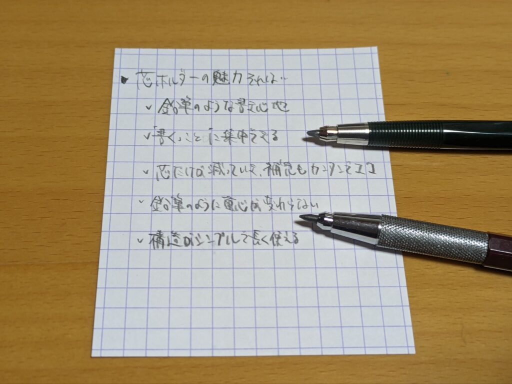 芯の違いはもちろんシャーペンでも感じられますが、特に芯ホルダーに至っては芯が太いため、よりはっきりとわかります。