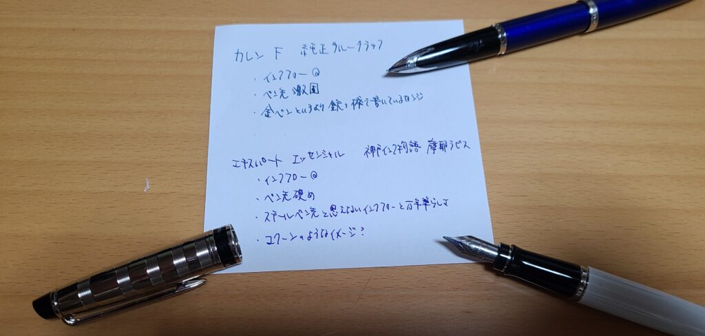 エキスパートには以前愛用していたけど最前線を退いてしまったスーベレーンM300にいれていた「神戸インク物語 摩耶ラピス」を、カレンは純正のブルーブラックインクを入れています。
