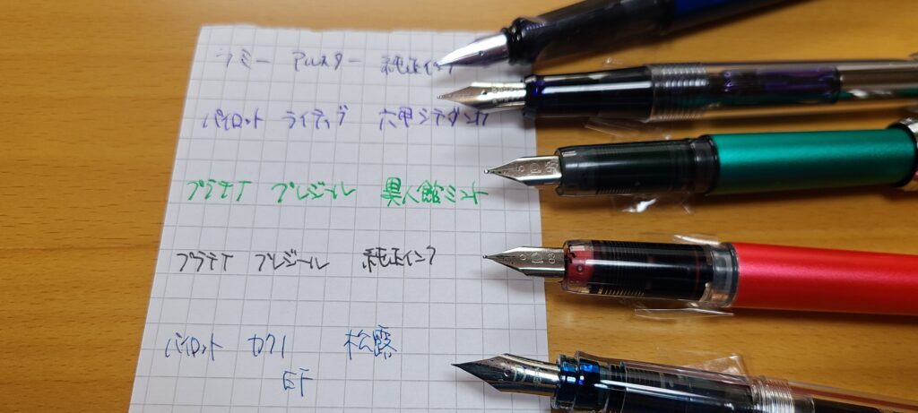 今回紹介する鉄ペン君たちは、「ラミー・アルスター」「パイロット・ライティブ」「同じくカクノ」「プラチナ・プレジール」です。