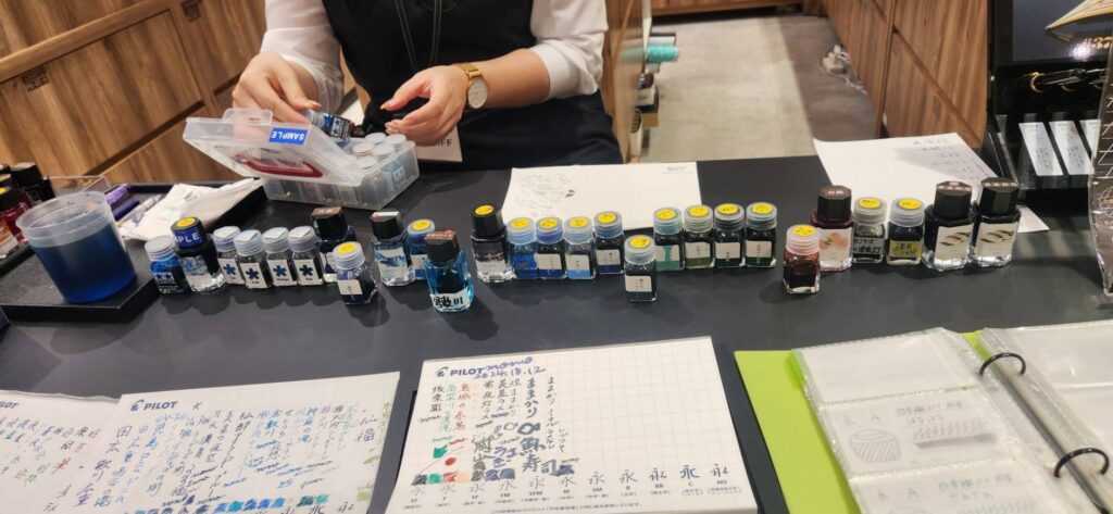 「試筆できます」のPOPに惹かれ、お願いしたところ、非常に快く、実に20種類以上のインクを試させていただき、