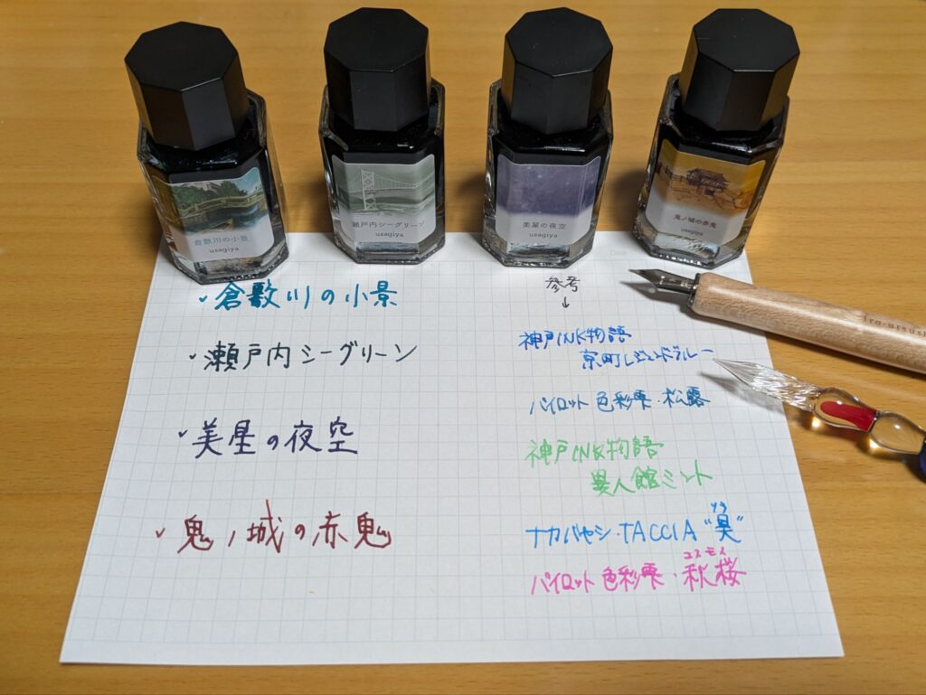 その中でも、こういったオリジナルインクは、コンセプトがはっきりしていて、それを思い浮かべながらその色を見てみると、非常に感慨深く、楽しくなります。