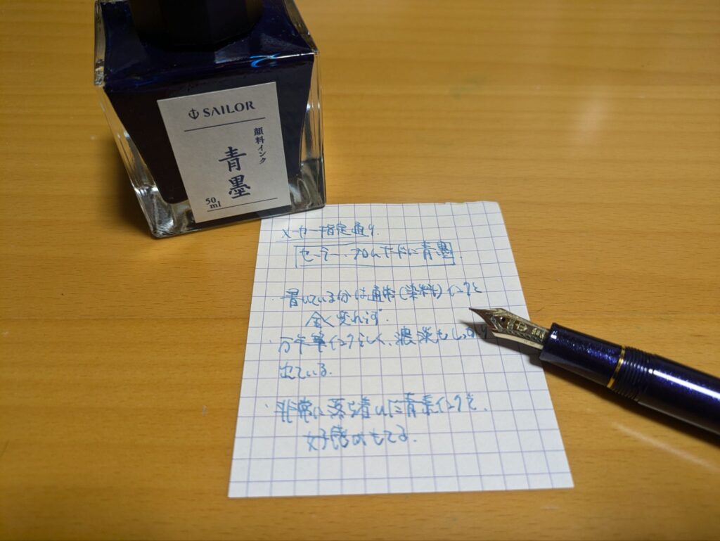 ペリカンのロイヤルブルーに近いということを聞いたことがありますが、以前持っていた、青墨と同じくセーラー製のナガサワ文具さんオリジナルインク、「京町レジェンドブルー」と比較して、ちょっと黒っぽいスモーキーな青、という感じです。