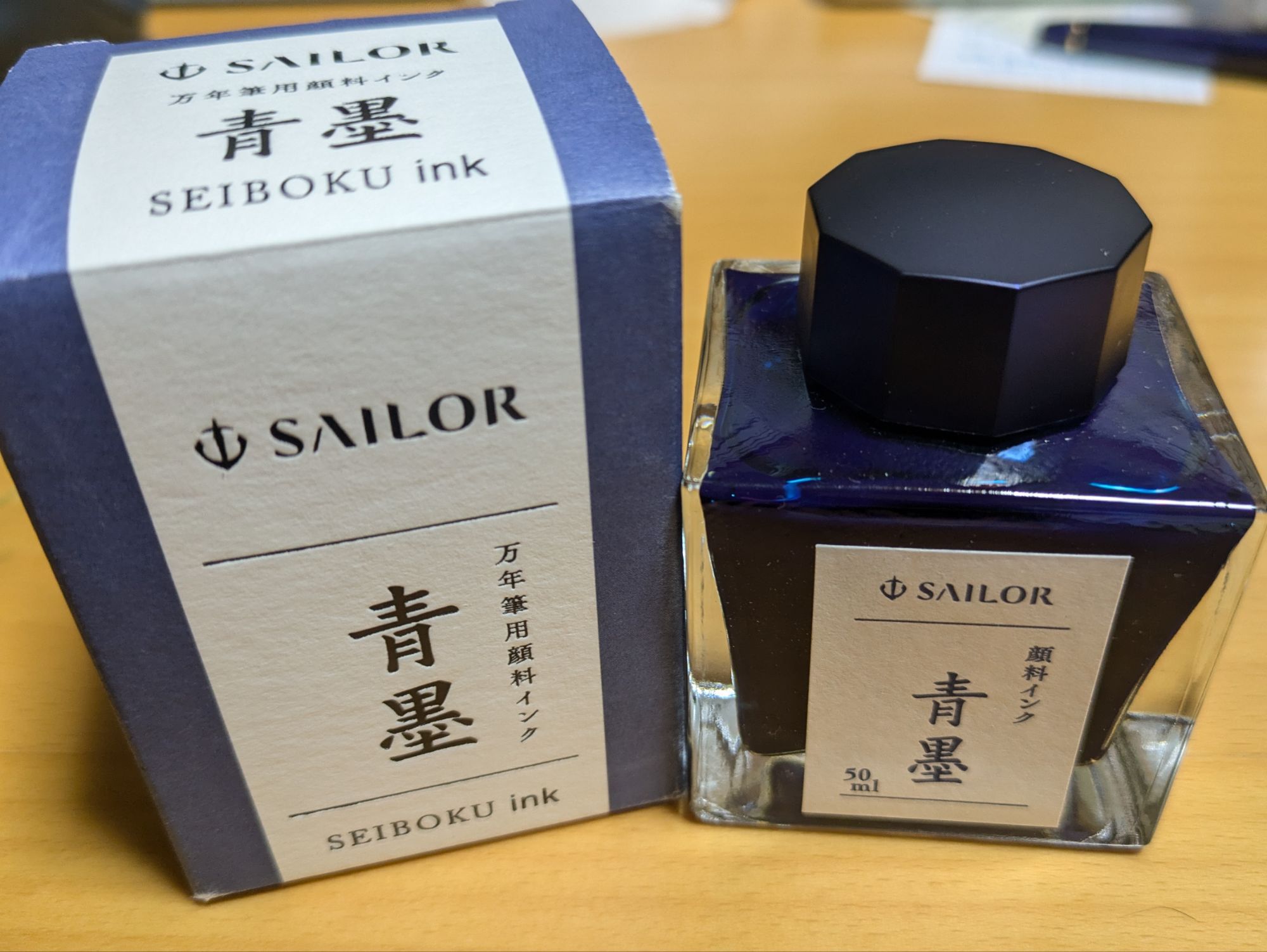 丸い瓶も机においていても映える、可愛いデザインですが、なんとなく青墨のイメージを考えると、この質実剛健な四角いパッケージも合っていると思います。