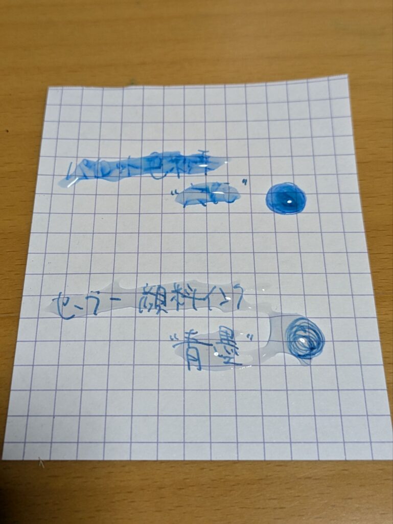 上がパイロット・色彩雫(染料インク)、下が青墨(顔料インク)です。