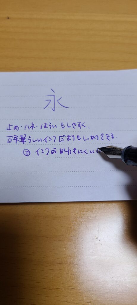 今回選んだのはインクを存分に味わうため「M(中字)」を選びましたが、インクだまり(字を止めた部分にできるインクの塊)もしっかり出来、この価格とは思えない「万年筆」を存分に味わえます。