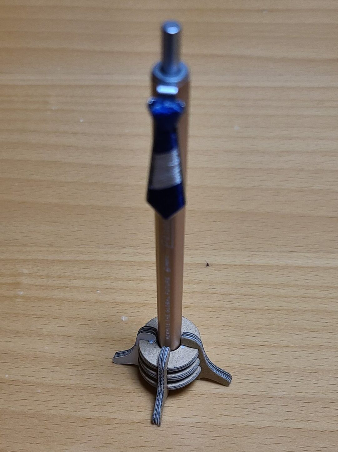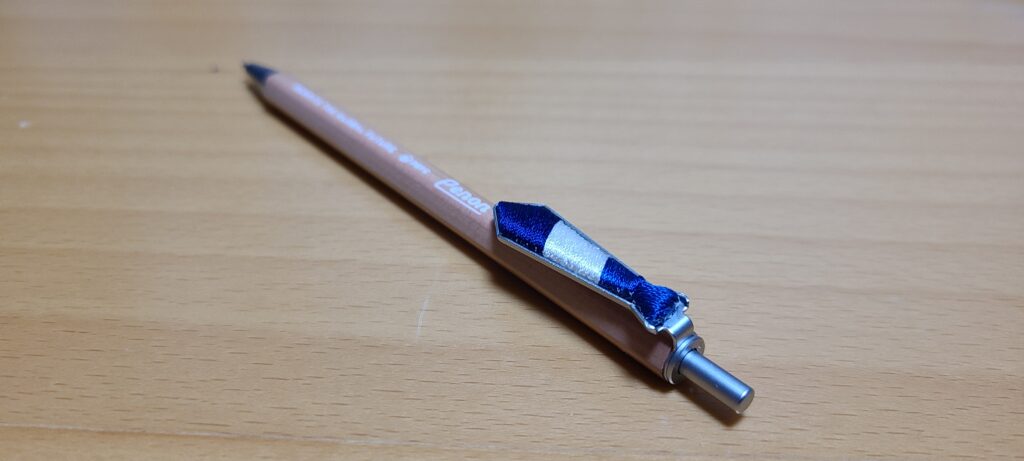 今回はネクタイ型のクリップをした木製ボールペンですが、他にもメガネ型クリップやフラップ型のノックをしたものなど、さらにはそれぞれの色・デザイン違いなど幅広いバリエーションがありました。