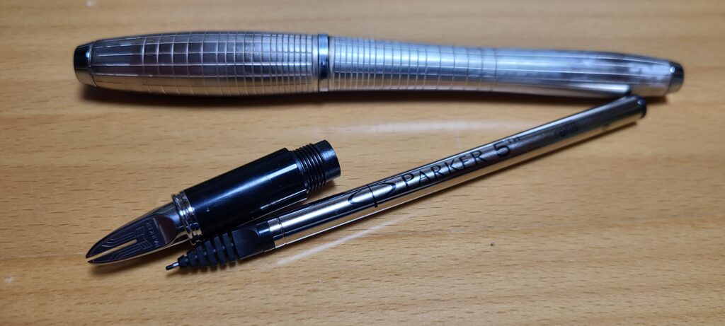 分解してみると、万年筆のような形をしたペン先部分とレフィール部分に分かれます。