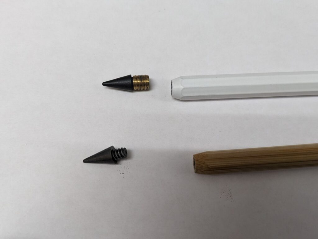 一言でいうと、「金属を混ぜた黒鉛で書く、とても減りにくい鉛筆」です。