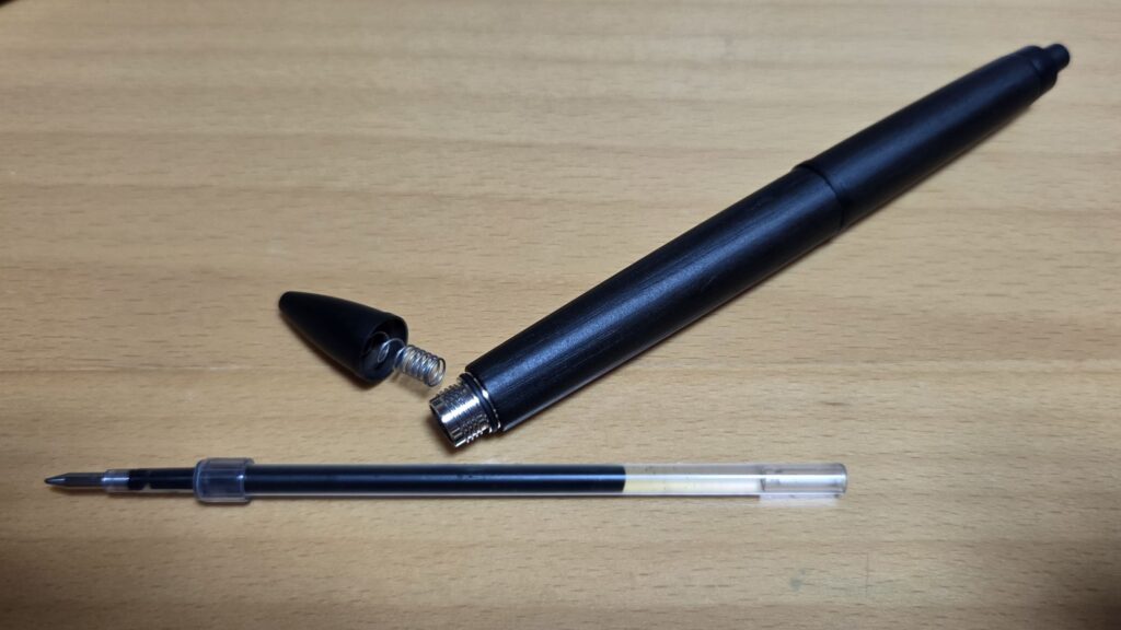 しかしそれには理由があり、多色はグリップ部のみが樽素材であり、ベースは通常のジェットストリーム4+1であるのに対し、シングルは全身が樽素材であることに加え、先述のようにノック音や質感にもこだわった専用のモデルであることに起因しています。