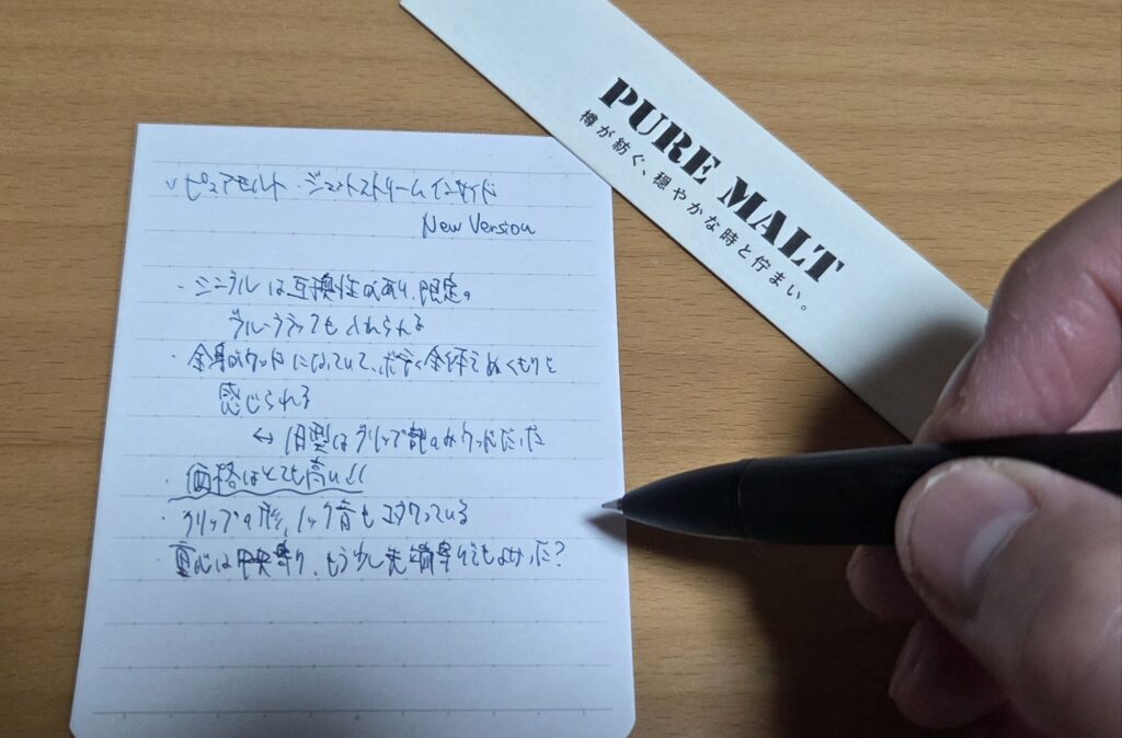ピュアモルト・ジェットストリームインサイドは、単なる筆記具としてだけではなく、デジタル時代だからこそ価値がある贅沢な一本であり、忙しい日常の中でふと指先に届く「木の温もり」を与えてくれる存在といえます。