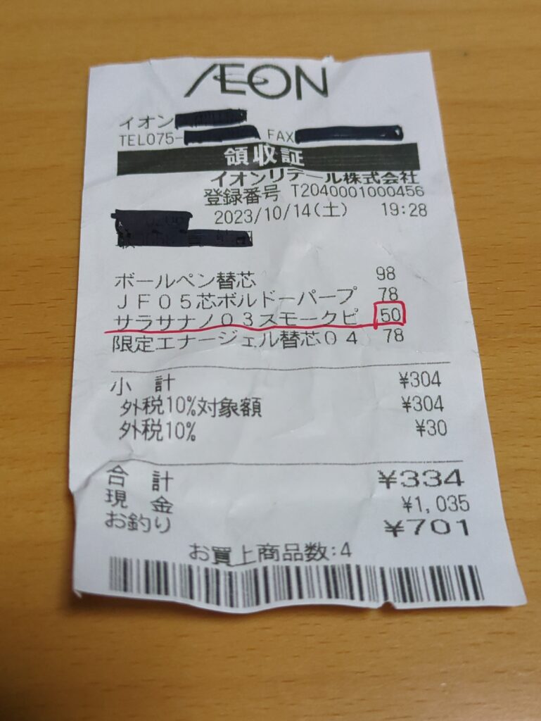 とはいえ、本数も限定ですし、どの商品が安いかはそのイオンによっても違いますので、必ずしも好みのものに出会えるかはわかりませんが、「どんなものでもいいので、安く筆記具を買いたい」「お宝発掘が好き」「話題になっていたものを安く買いたい」という方には思いがけない穴場といえます。